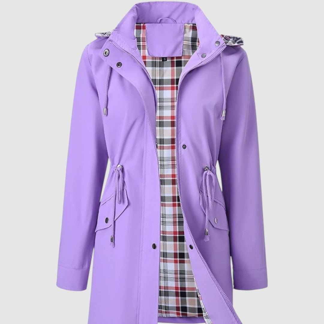 Tento kabát je ideální volbou pro deštivé a větrné dny. Díky nepromokavému materiálu vás spolehlivě ochrání před nepřízní počasí, zatímco praktická kapuce a stahovací pas dodávají funkčnost i ženský vzhled. Vnitřní podšívka s kostkovaným vzorem zajišťuje pohodlí a originální styl.