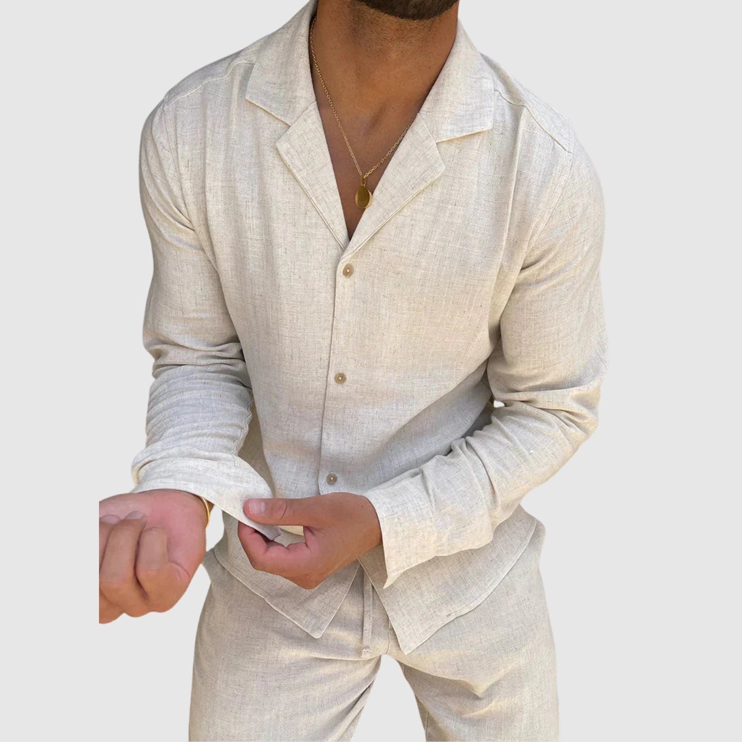 Tento lněný komplet nabízí dokonalou kombinaci pohodlí a stylu. Jeho lehká a prodyšná tkanina vás udrží v pohodlí po celý den, zatímco jeho sofistikovaný design vám umožní vypadat bezchybně při každé příležitosti, od neformálních setkání až po speciální události.