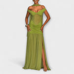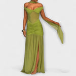 Vyrobeny z luxusní, elastické slinky látky v bohatém olivově zeleném odstínu, jsou plně podšité pro pohodlí a styl. Nízký výstřih do V na zádech dodává dotek smyslnosti, zatímco nařasení a vysoký rozparek krásně zvýrazňují vaši postavu.
