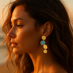 Náušnice Aurora zachycují zlaté a modré odrazy slunce na vodě. S designem zlatého saténu a tyrkysovými prvky vyzařují harmonii vln a klid letního rána.