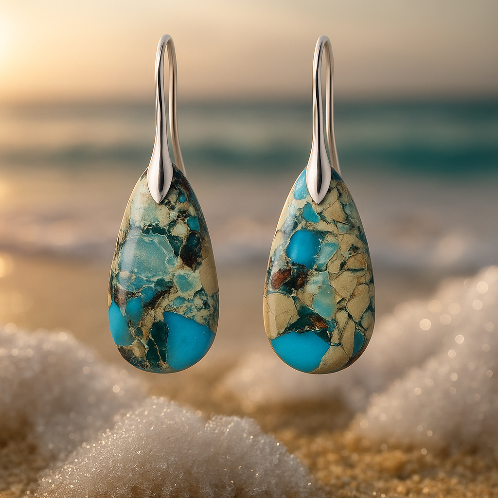 Náušnice Orelia jsou inspirovány ohromující krásou Big Sur, kde se drsné skály setkávají s hluboce modrým mořem. Tyrkysové kameny dokonale ladí se zlatými béžovými tóny pobřeží mořské pěny a vytvářejí kompozici, která připomíná džunglové krajiny a čistou svobodu.