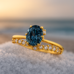 Prsten Stella di Marea zosobňuje jasné světlo, v němž se nebe odráží ve vodě. Centrální oválný modrý krystal, hluboce broušený jako oceán, je obklopen třpytivými bílými zirkony a září při každém pohybu.