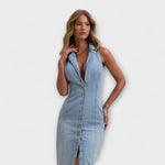 Představujeme naše maxi šaty s halter krkem! Tento úchvatný kousek je vyroben z kvalitního denimu s mírným praním a je dokonalým doplňkem vaší jarní/léto garderoby.