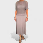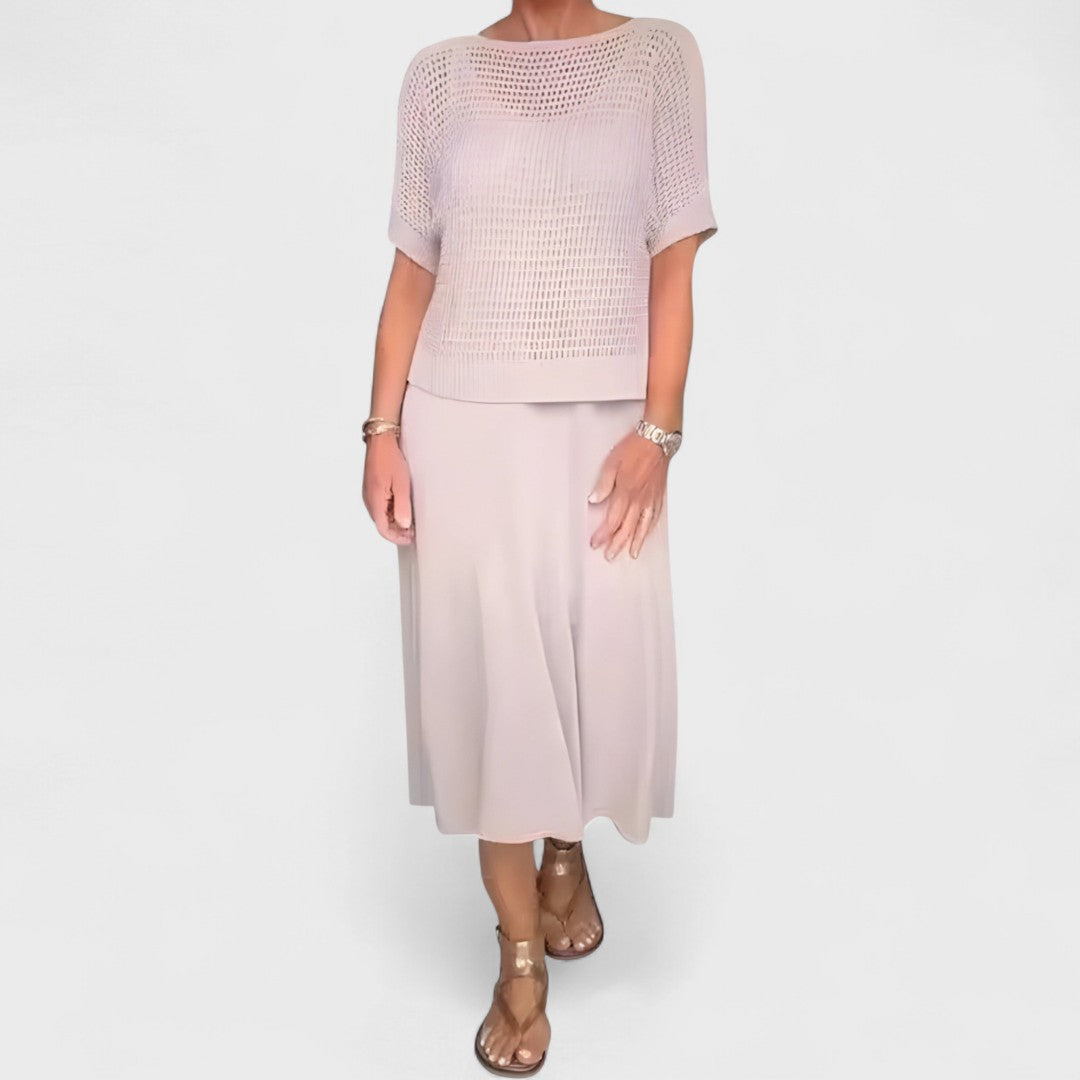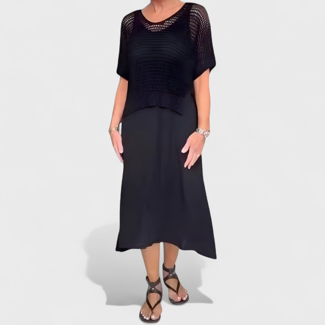 Šaty Claudia kombinují pohodlný pletený horní díl s volně splývavým spodním dílem – lehké a vzdušné řešení na horké dny. Kulatý výstřih a strukturovaný top jemně tvarují postavu, zatímco volná sukně zajišťuje komfortní volnost. Ideální volba pro denní nošení, městské procházky nebo lehké obědové chvíle s přáteli.