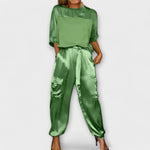 Tato dvoudílná souprava z prodyšného, měkkého materiálu nabízí elegantní a univerzální outfit, který je vhodný jak na den, tak na večer. Poloviční blůza dodává nádech rafinované elegance, zatímco volné kalhoty zajišťují maximální pohodlí a svobodu pohybu.