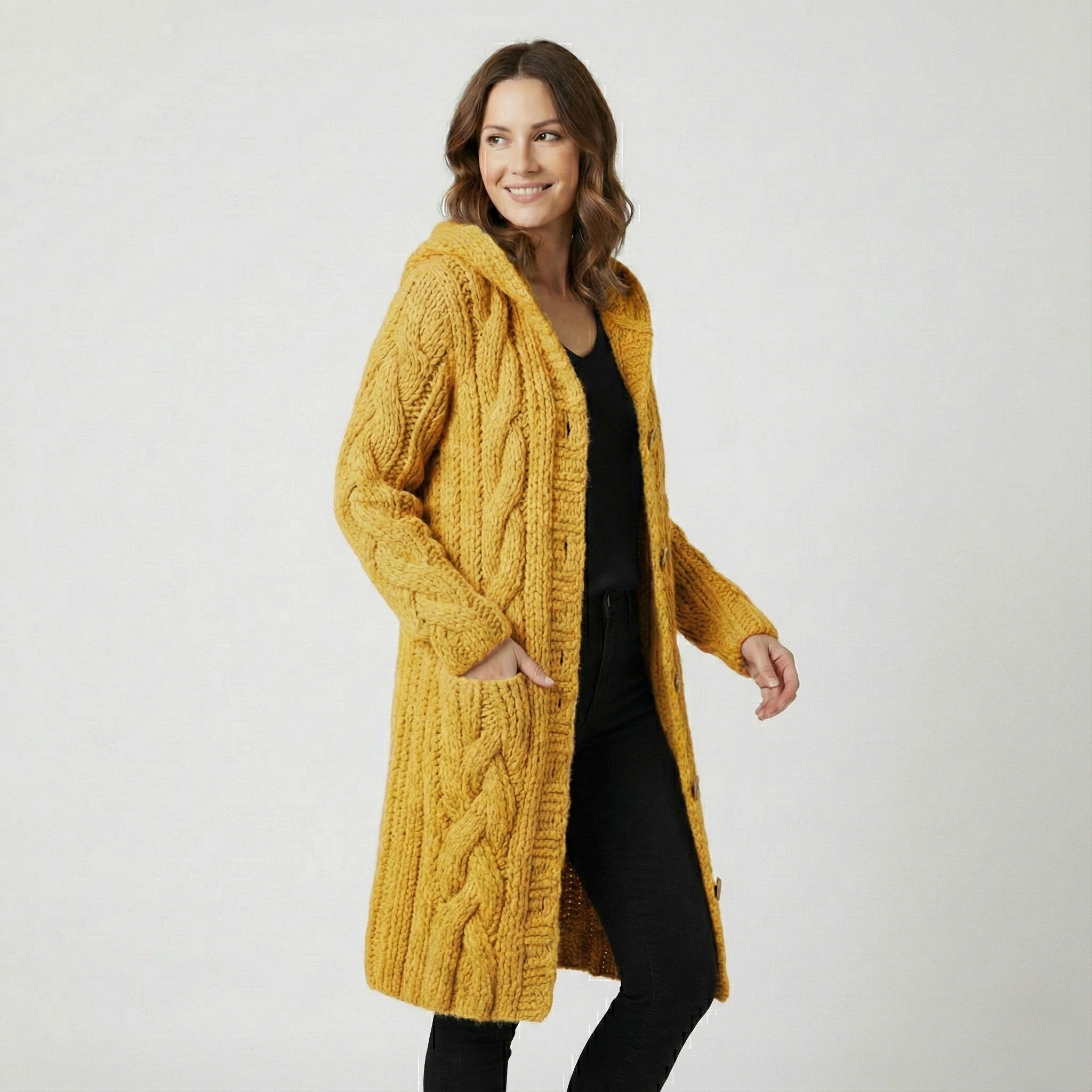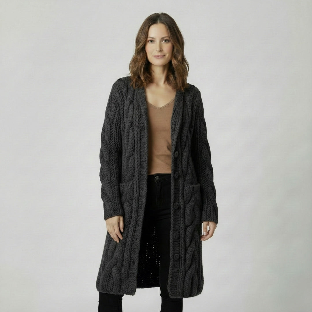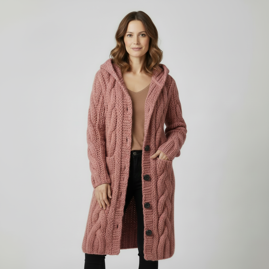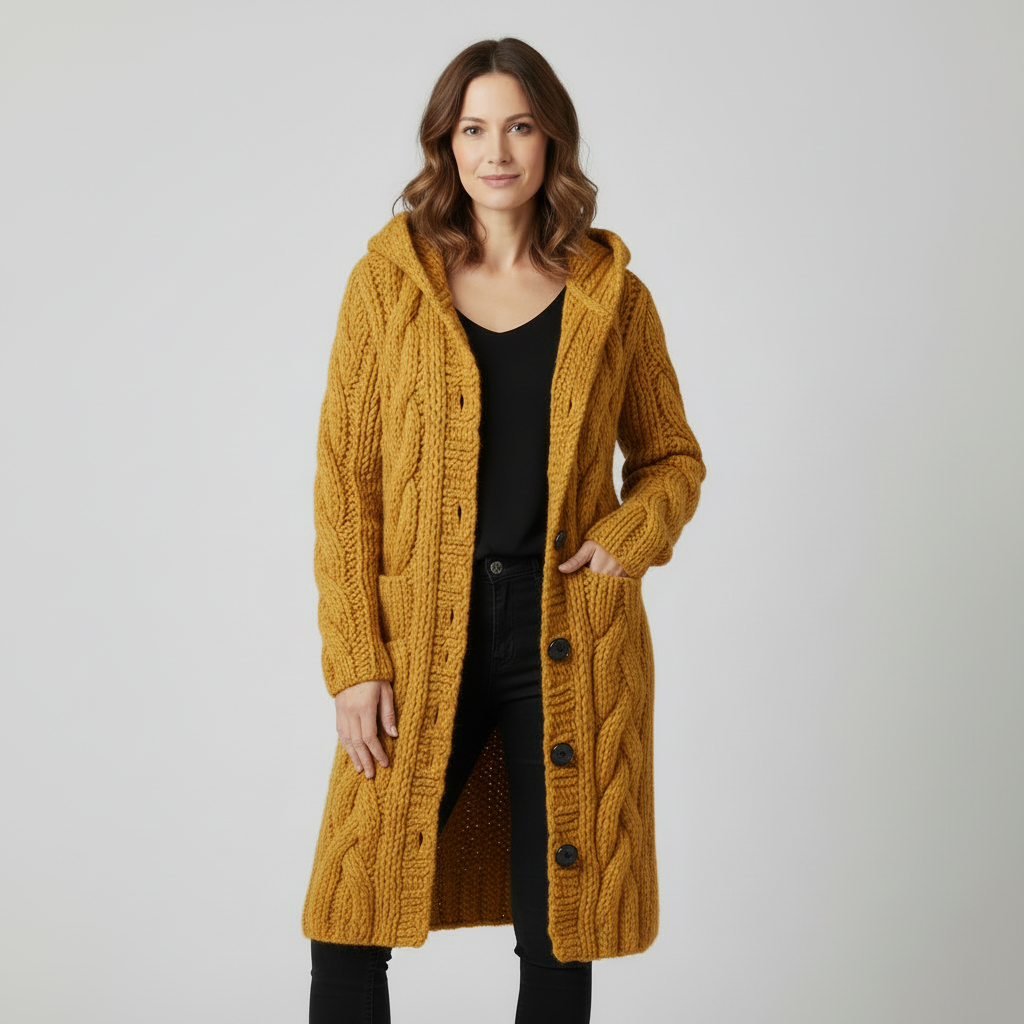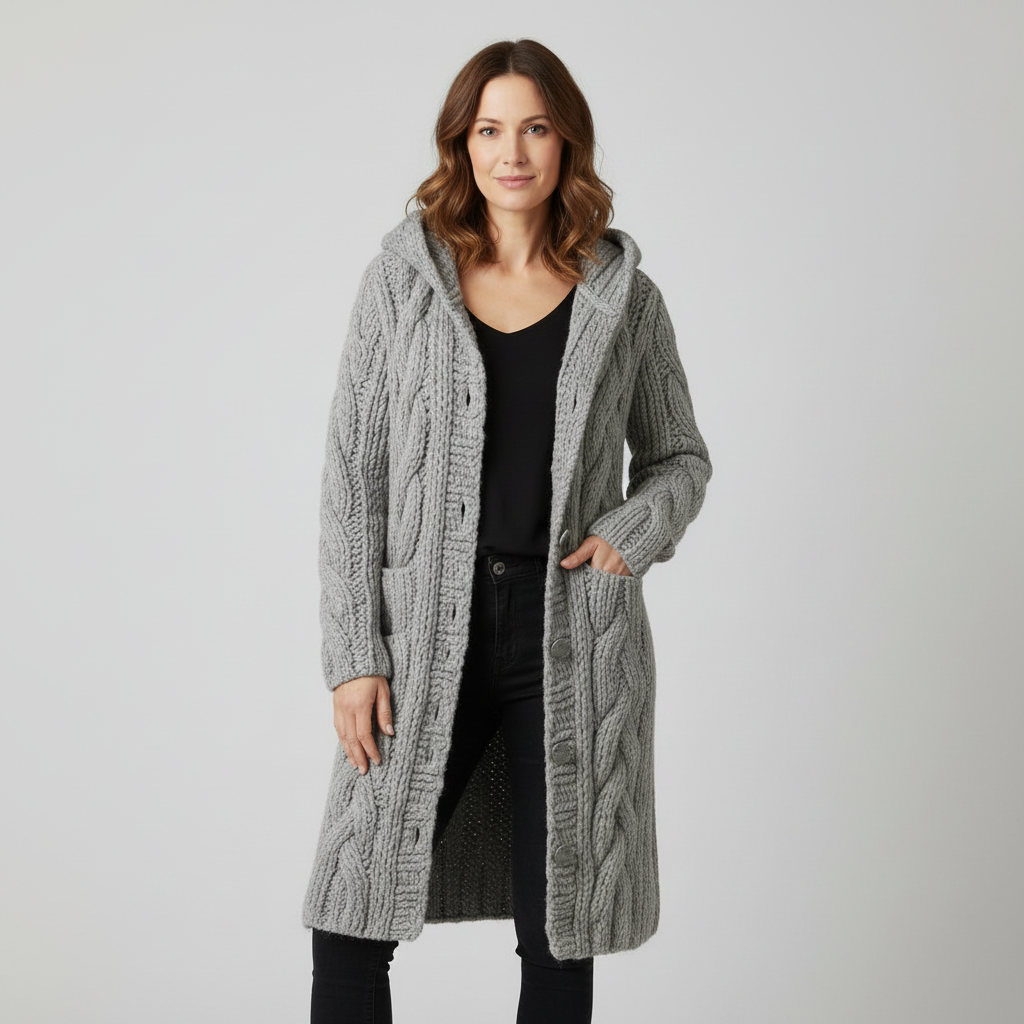 Tento dlouhý pletený kardigan s kapucí je jako teplá deka, kterou si můžete vzít s sebou kamkoli – doma na gauči, do kanceláře i na víkendovou procházku městem. Silná copánková pletenina dodává celému outfitu luxusní vzhled, zatímco praktické kapsy a knoflíky zajišťují maximální pohodlí a volnost při nošení. Stačí vyměnit džíny za šaty nebo přidat oblíbený šátek a z ležérního denního looku máte během chvilky útulný a stylový večerní outfit.