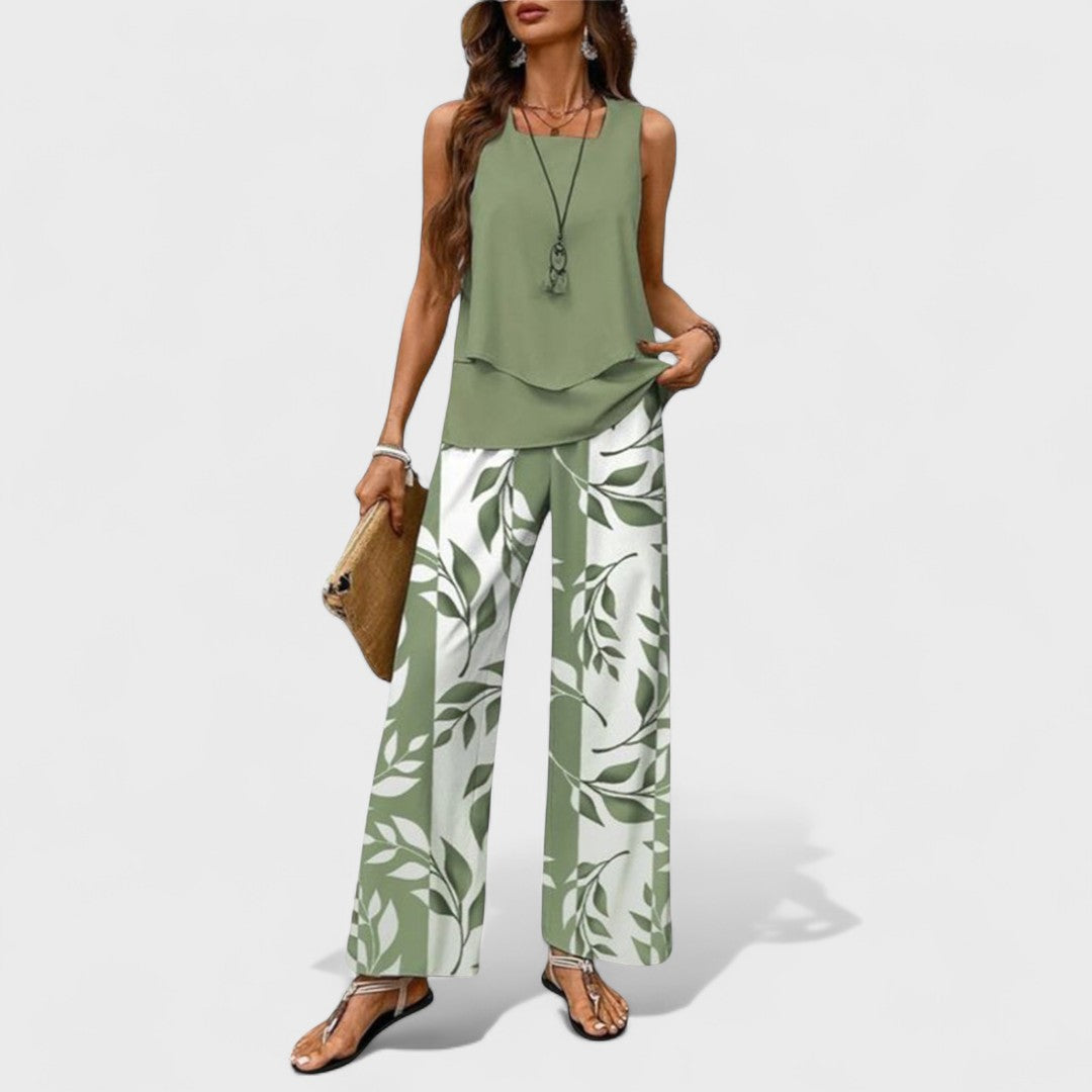 Set Katarína přináší luxus jednoduchosti a pohodlí ve stylové kombinaci. Horní část bez rukávů jemně obepíná postavu, zatímco lehké kalhoty s volným střihem dodávají pocit vzdušnosti a svobody. Vyrobený z kvalitního materiálu s jemným leskem, tento set je skvělou volbou pro pracovní dny, setkání s přáteli či letní večery plné elegance.