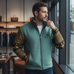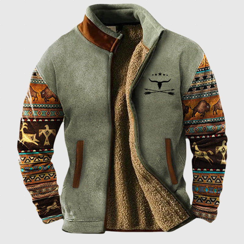 Objevte dokonalou kombinaci stylu a pohodlí s touto jedinečnou pánskou bundou ve westernovém stylu. Díky hřejivé plyšové podšívce vás spolehlivě ochrání před chladem, zatímco originální rukávy s detailními motivy bizonů a geometrickými vzory dodají vašemu outfitu nezaměnitelný charakter. Je to ideální volba pro muže, kteří hledají funkční a zároveň stylový kousek do svého zimního šatníku.